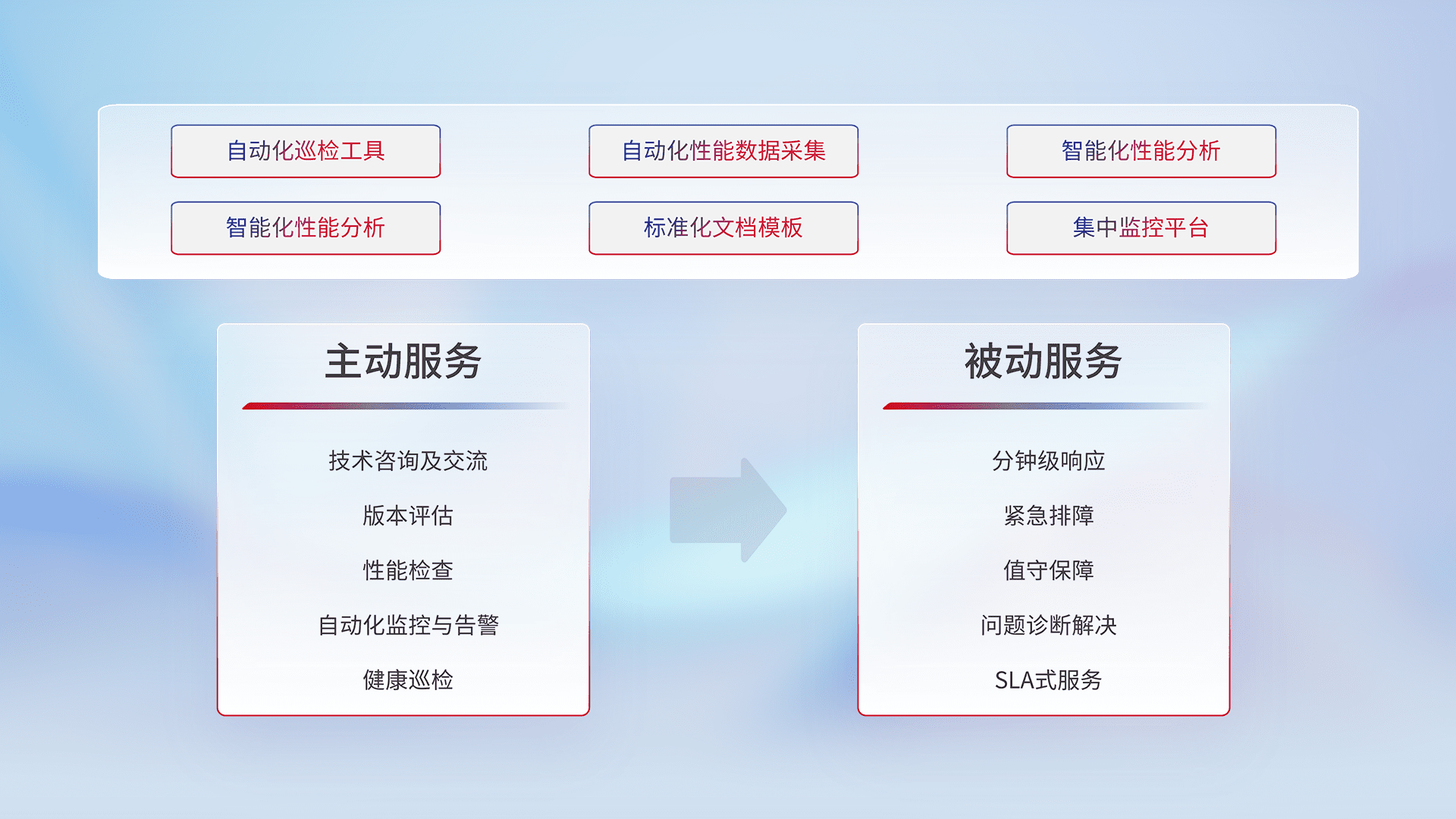 智能化工具和标准化文档,,保障服务质量,,,,提供主动服务(包含技术咨询、、、、版本评估、、、、性能检查、、自动化监控与告警、、、、健康巡检)和被动服务包含(分钟级响应、、、、紧急排障、、值守保障、、、、问题诊断解决、、SLA服务)。。。