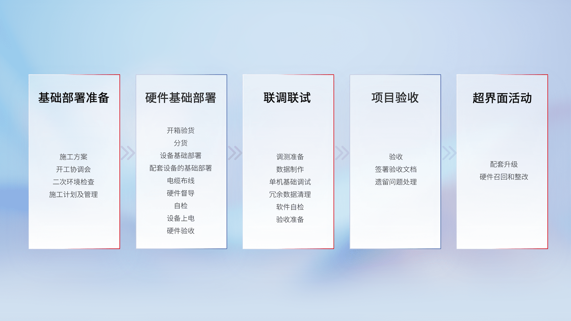 从基础部署准备、、、、硬件基础部署、、、、联调联试、、项目验收、、、、越界面活动的全过程可追溯,,,保证施工质量和进度。。。